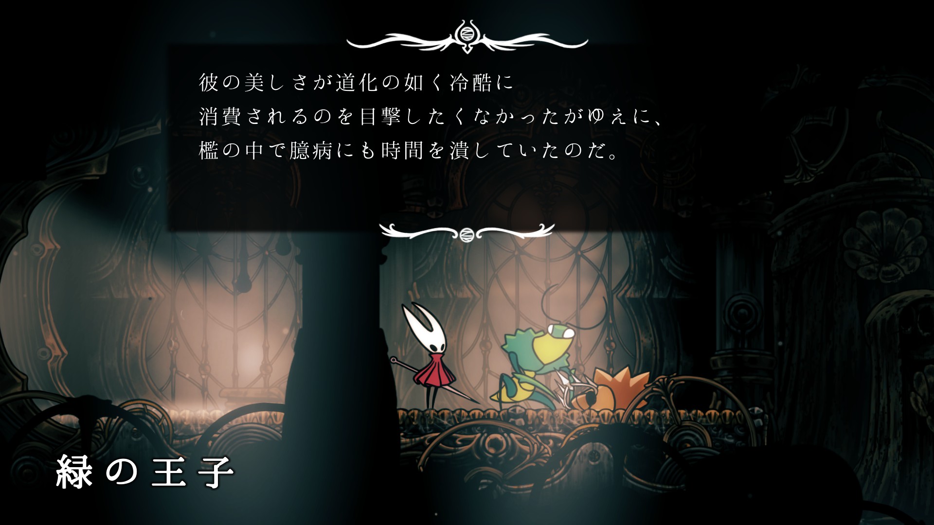 その後に牢獄エリア(?)で開放したイケ虫「緑の王子」に何度かエンカウントした。どうやら王子と相方を模したカラクリ人形らしい。しかも、その相方(伴侶?)は亡国を救うために自ら殻(身)と魂を捧げカラクリを作ったという設定…なにその尊さ。しかもこの二体のカラクリ、どうみても両方「男」なんだけど…!? これはもしかしてBL(Bugs Love)なの!? 🦗×🦗